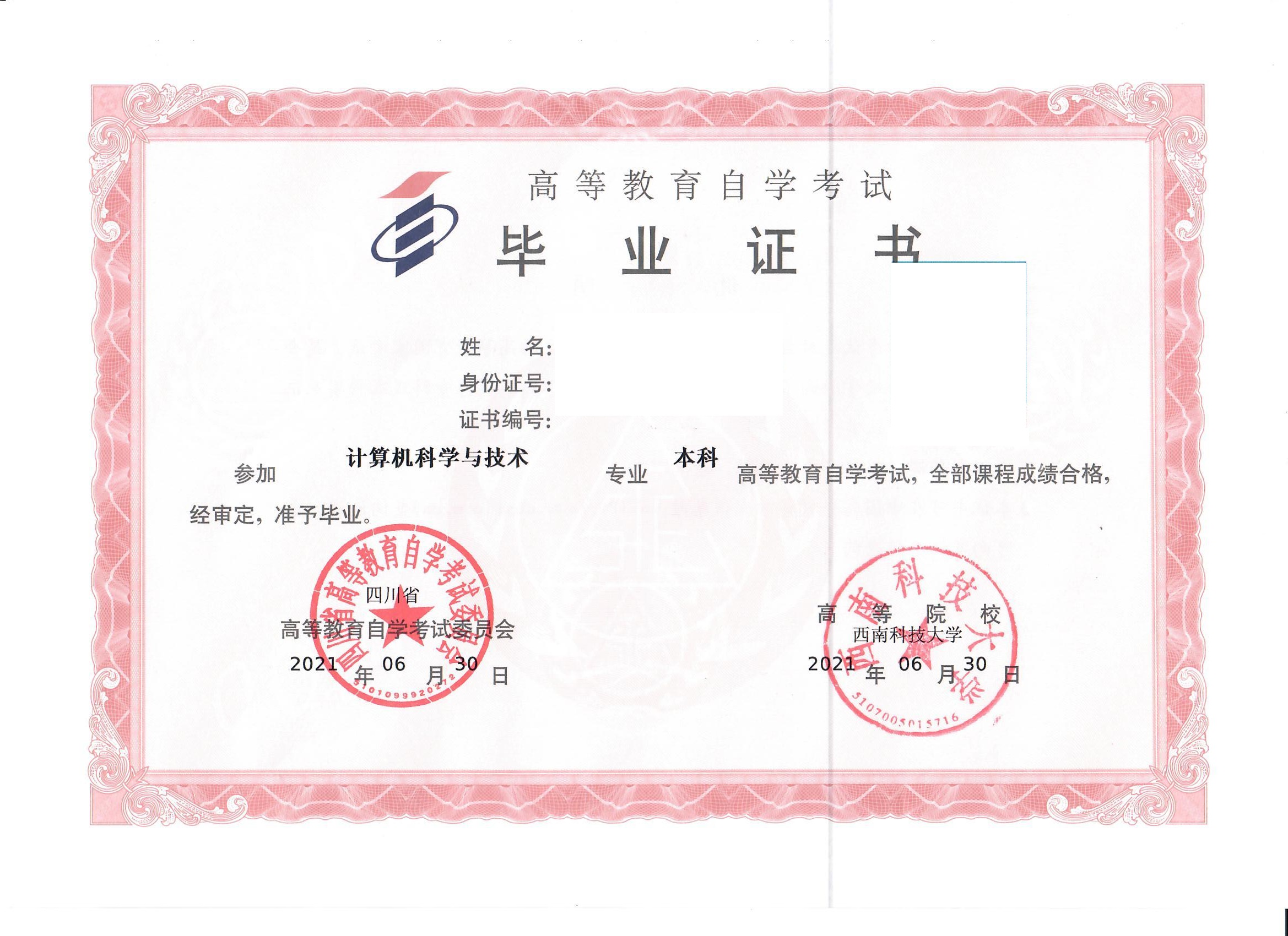 德赢Vwin官方区域合作伙伴高等教育自学考试证书样本