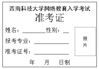 考生准考证由各学习中心按照我院规定的样式编制并制做(见下图),同时按考场打印考生名单(准考证号、姓名、性别、报考专业、层次)一式两份,考室贴一份,另一份交巡考人员带回,并将实际参考人员名单用电子邮件形式发至我办。