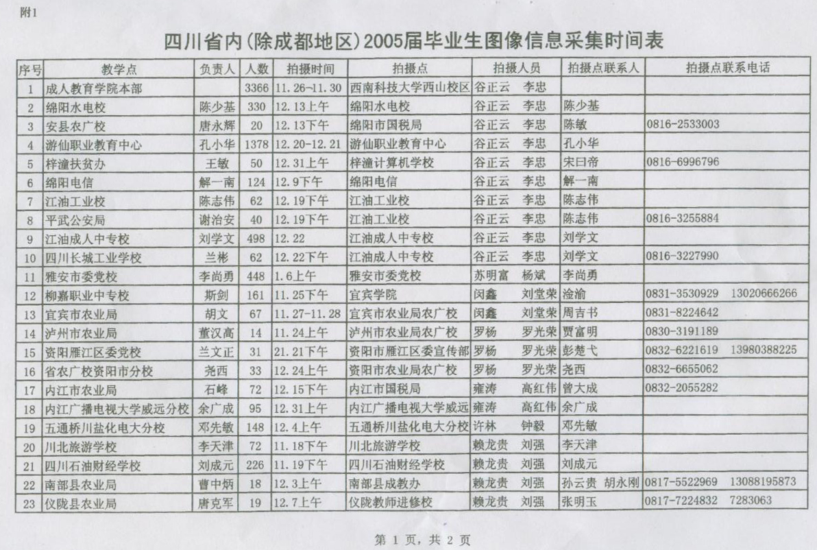 附1、四川省(除成都地区)2005届毕业生图像信息采集时间表