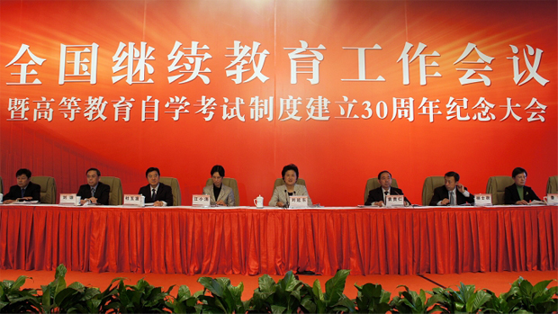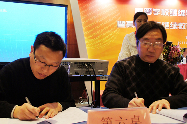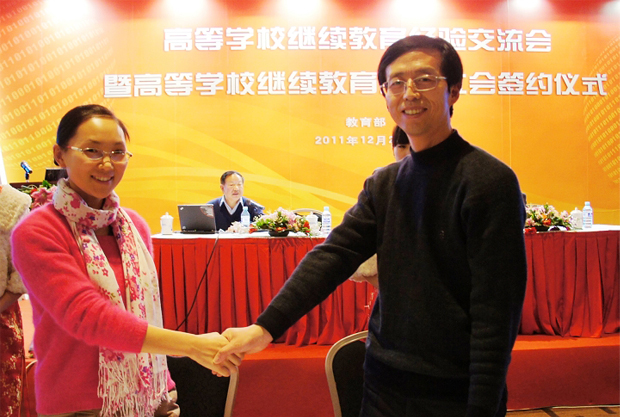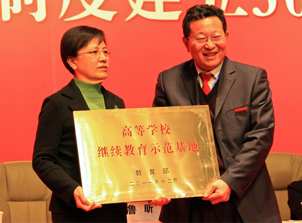 在全国继续教育工作会上,王营池院长代表学校接受了教育部副部长鲁昕颁发的“高校继续教育示范基地项目”授牌。李玉香院长与四川峨胜水泥股份有限公司代表,高德政副院长与四川里伍铜业股份有限公司总经理王发清参加了“高校服务社会百对签约”仪式。
