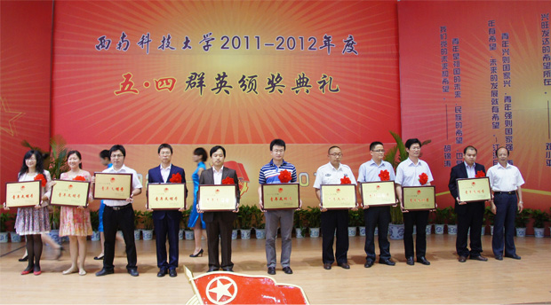 5月4日下午,我校纪念中国共产主义青年团成立90周年暨2011—2012学年度五四群英表彰大会在办公楼学术大厅召开。王俊波、肖正学等校领导及相关部门负责人和团员青年代表600多人参加了大会。