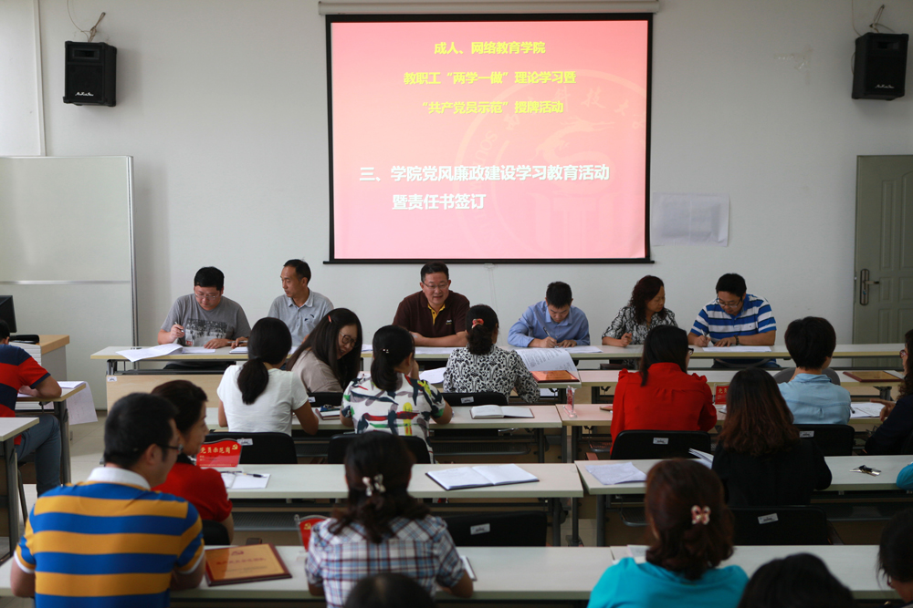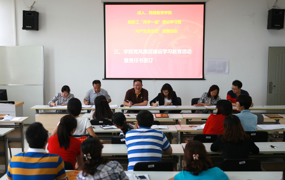 9月19日下午,学院召开全院职工理论学习大会,组织学习四川省教育厅关于“依法治教”和学校党委关于党风廉政建设的工作要求,组织各科室负责人签订《德赢Vwin官方区域合作伙伴成人、网络教育学院2016年度党风廉政建设责任书》和《成人、网络教育学院党总支落实党风廉政建设责任承诺书》。会议由学院党总支书记王天恒同志主持。