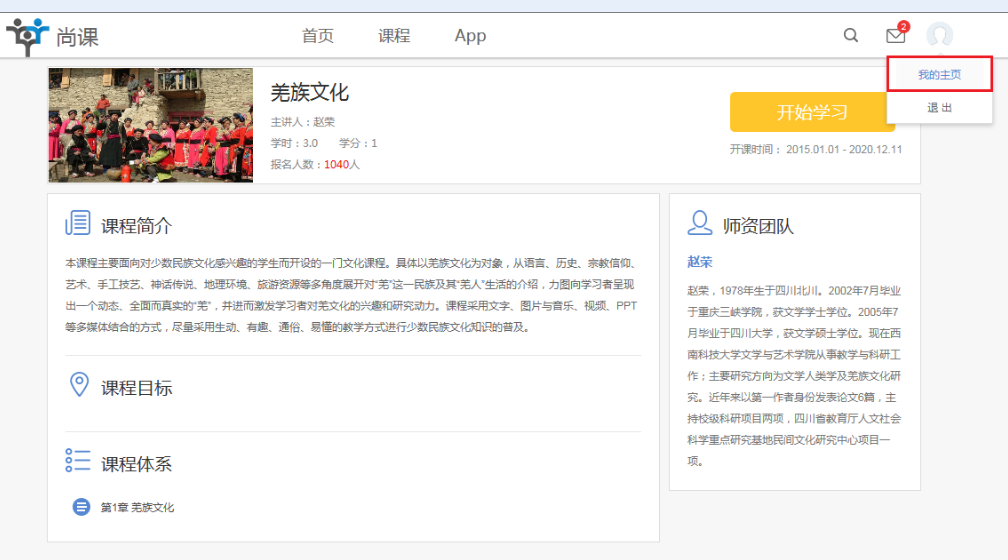 6、鼠标移动到右上角,点击“我的主页”进入已选课列表;