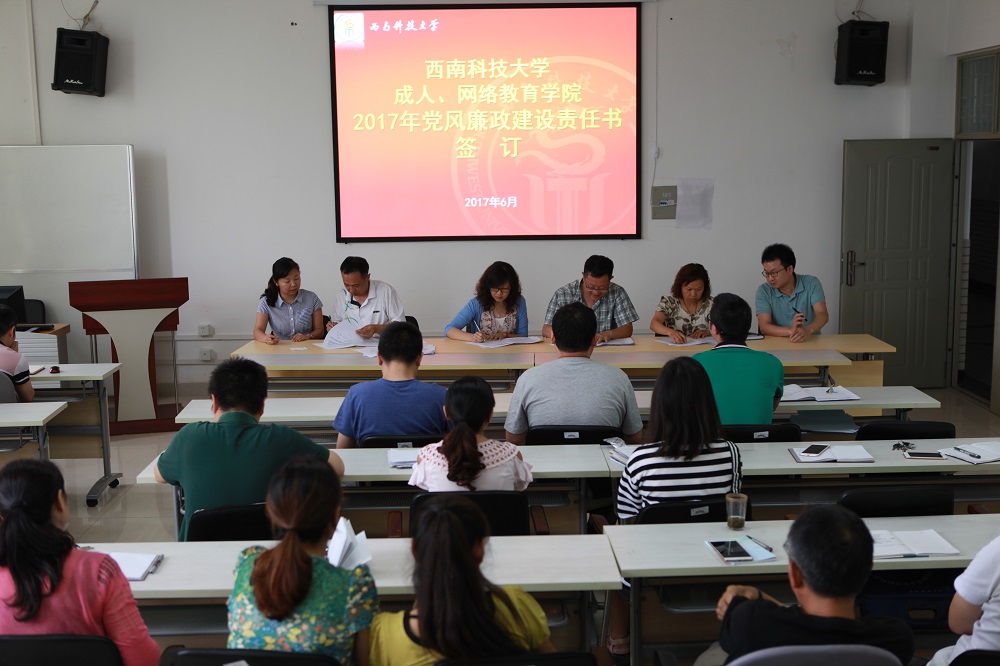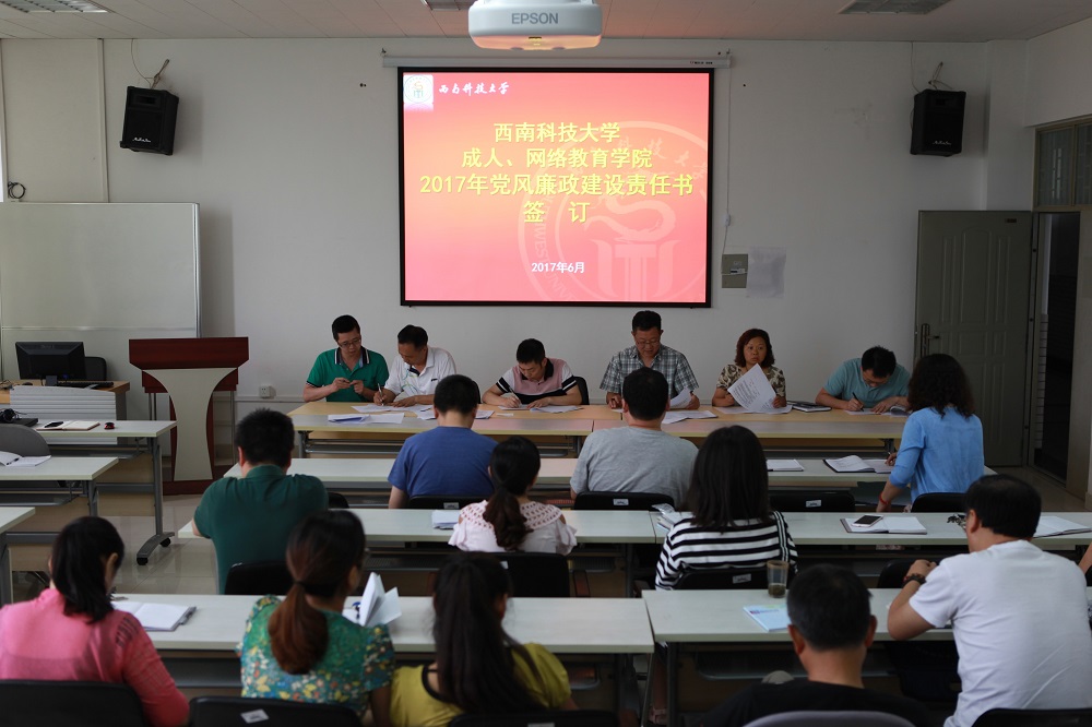 最后,学院各科室负责人与学院分管领导进行了“德赢Vwin官方区域合作伙伴成人、网络教育学院2017年党风廉政建设责任书”的签订。