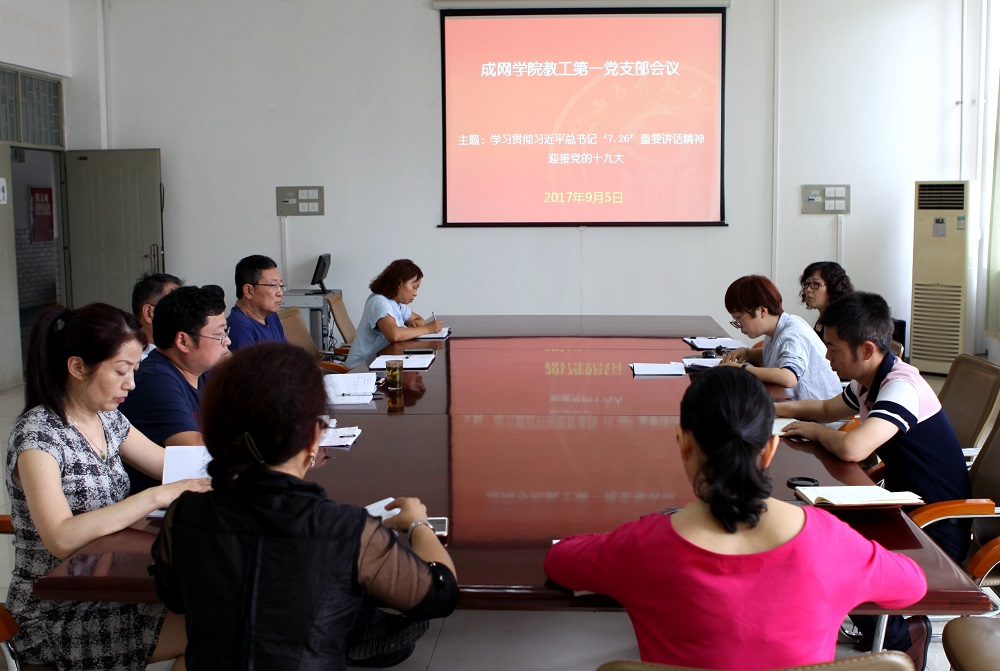 开学伊始,成网学院全体教职工热情饱满的投入到紧张忙碌的新学期工作中。9月5日下午,成网学院教工第一党支部在学院四楼会议室开展了以 “学习贯彻习近平总书记‘7.26’重要讲话精神,迎接十九大”为主题的研习会,会议由党支部宣传委员陈娜主持。