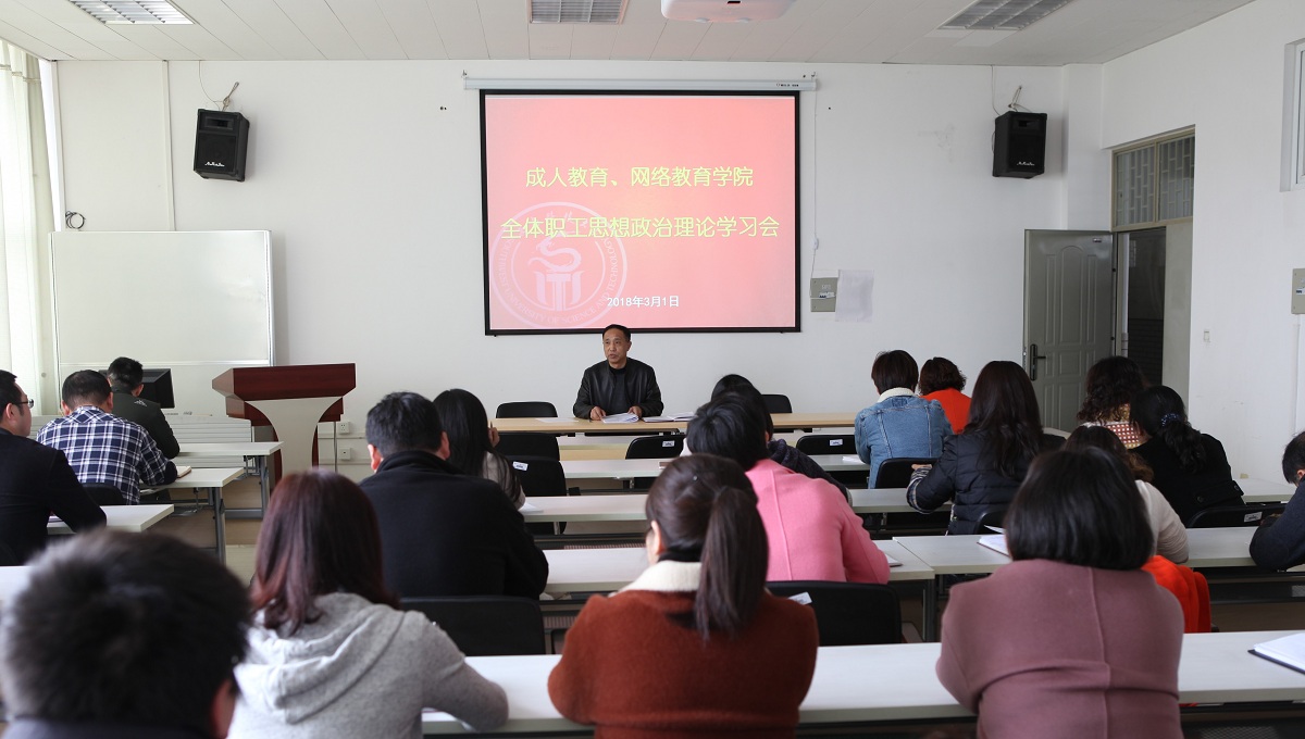 3月1日下午,在学院五楼会议室召开思想政治理论学习会,学院党总支书记王天恒向全体职工传达了习近平总书记来川视察重要讲话精神,并传达了学校干部大会精神和学校新学期工作要求。