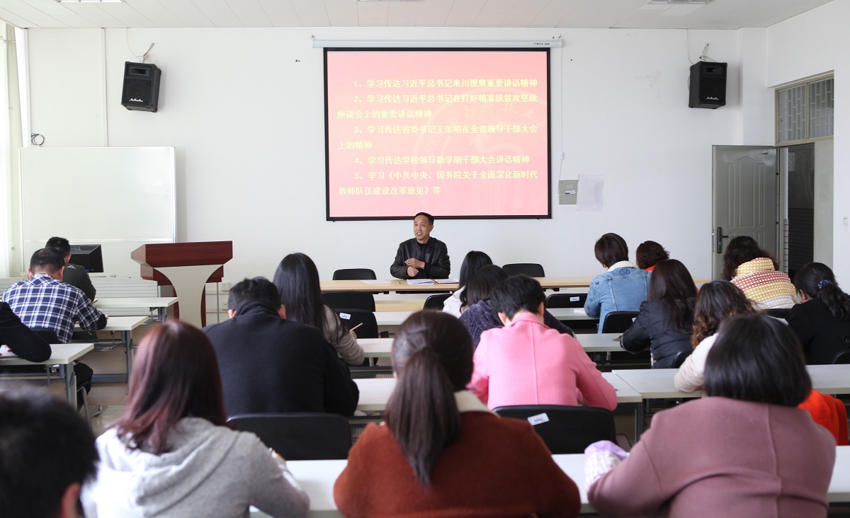王天恒首先传达了《习近平总书记来川视察重要讲话精神》、《习近平总书记在打好精准脱贫攻坚战座谈会上的的重要讲话精神》和四川省委王东明书记在《全省领导干部大会的精神》及重大意义。组织学习传达了学校党委书记庄天慧所作的《以习近平新时代中国特色社会主义思想为指导奋力推进特色鲜明高水平大学建设》报告和学校干部大会精神,还组织职工学习了《中共中央、国务院关于全面深化新时代教师队伍建设改革意见》、《普通高等学校本科专业类教学质量国家标准》等。