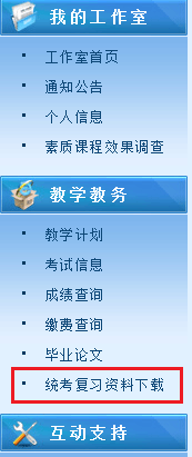 4、请学生登陆“西科在线”进入自己的“学生工作室”,点击左侧“教学教务”中的“统考复习资料下载”下载统考复习资料。