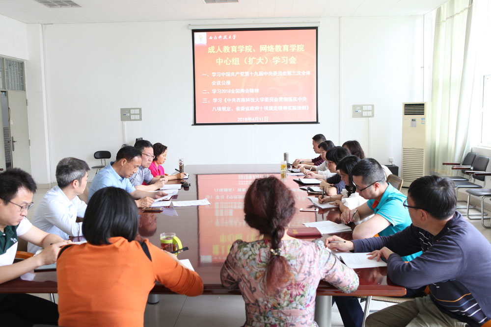 4月11日下午,成网学院党总支在学院四楼会议室召开了二级中心组(扩大)学习会,会议由党总支书记王天恒同志主持。