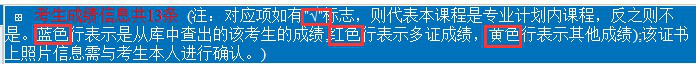 特别提醒:考生统考成绩背景色为色,请各申报点注意核实其他颜色成绩。 (红色指用证书替代的成绩(西科大学生不涉及)。黄色为免考成绩。