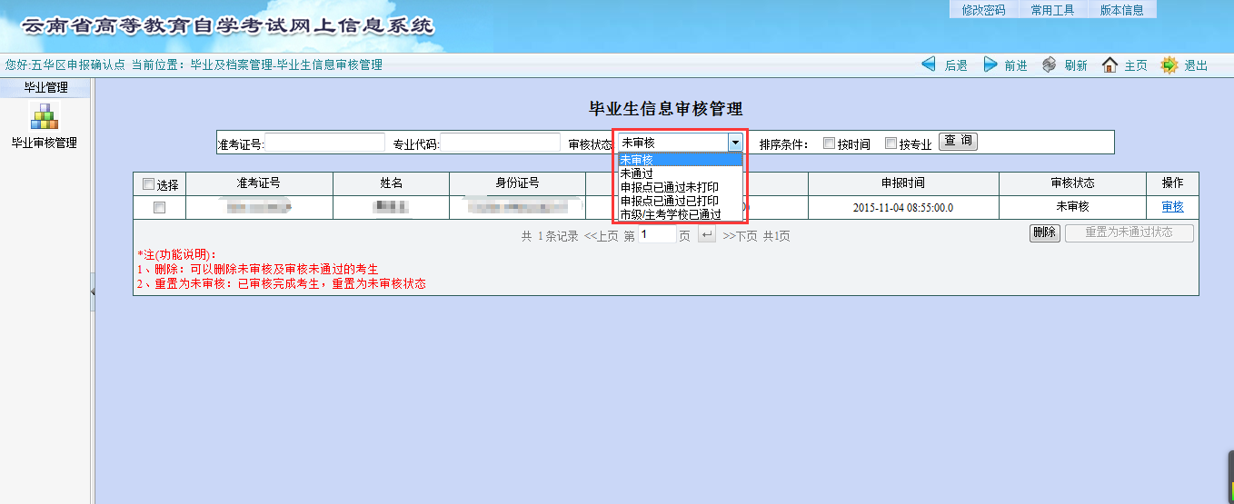 功能:具有初审确认功能,查看考生申报信息,打印《云南省高等教育自学考试毕业生登记表》。