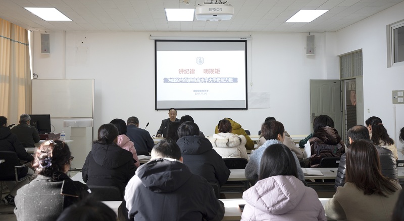 王天恒以《讲纪律 名规矩——为建设特色鲜明高水平大学贡献力量》为主题,从“认清形势 党风廉政建设任重道远、严纪明规 加强党政纪律法规学习、警钟长鸣 高校党风廉政问题示警、筑牢防线 不断提升拒腐防变能力”等四个方面详实阐述了“讲纪律、守规矩的重要意义和具体要求,并组织学习了《中国共产党纪律处分条例》《中国共产党问责条例》《中华人民共和国公职人员政务处分法》《事业单位工作人员处分暂行规定》《新时代高校教师职业行为十项准则》《教师师德失范负面清单》等内容,并结合学院工作实际要求全院职工廉洁自律,强化相互提醒、警示,提高防范、发现、处置违规违纪违法问题的意识和能力