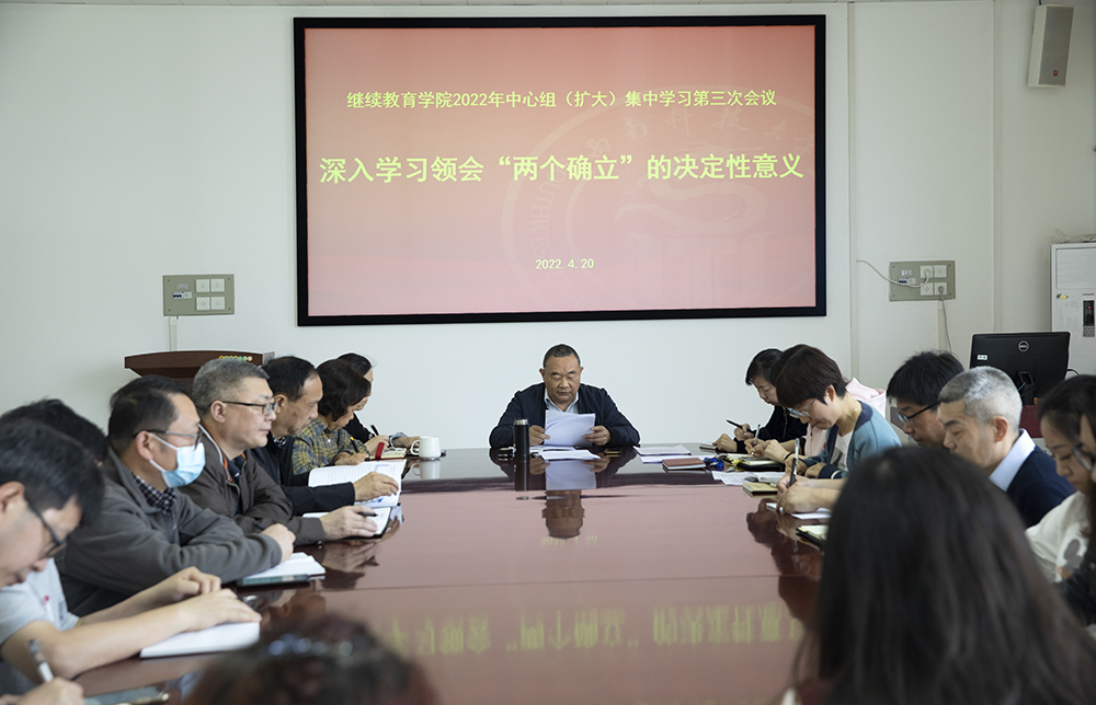 4月20日下午,学院党总支召开了“深入学习领会‘两个确立’的决定性意义”中心组(扩大)学习会,学院科级以上干部及支部书记参加会议,会议由学院党总支书记张昌健主持。