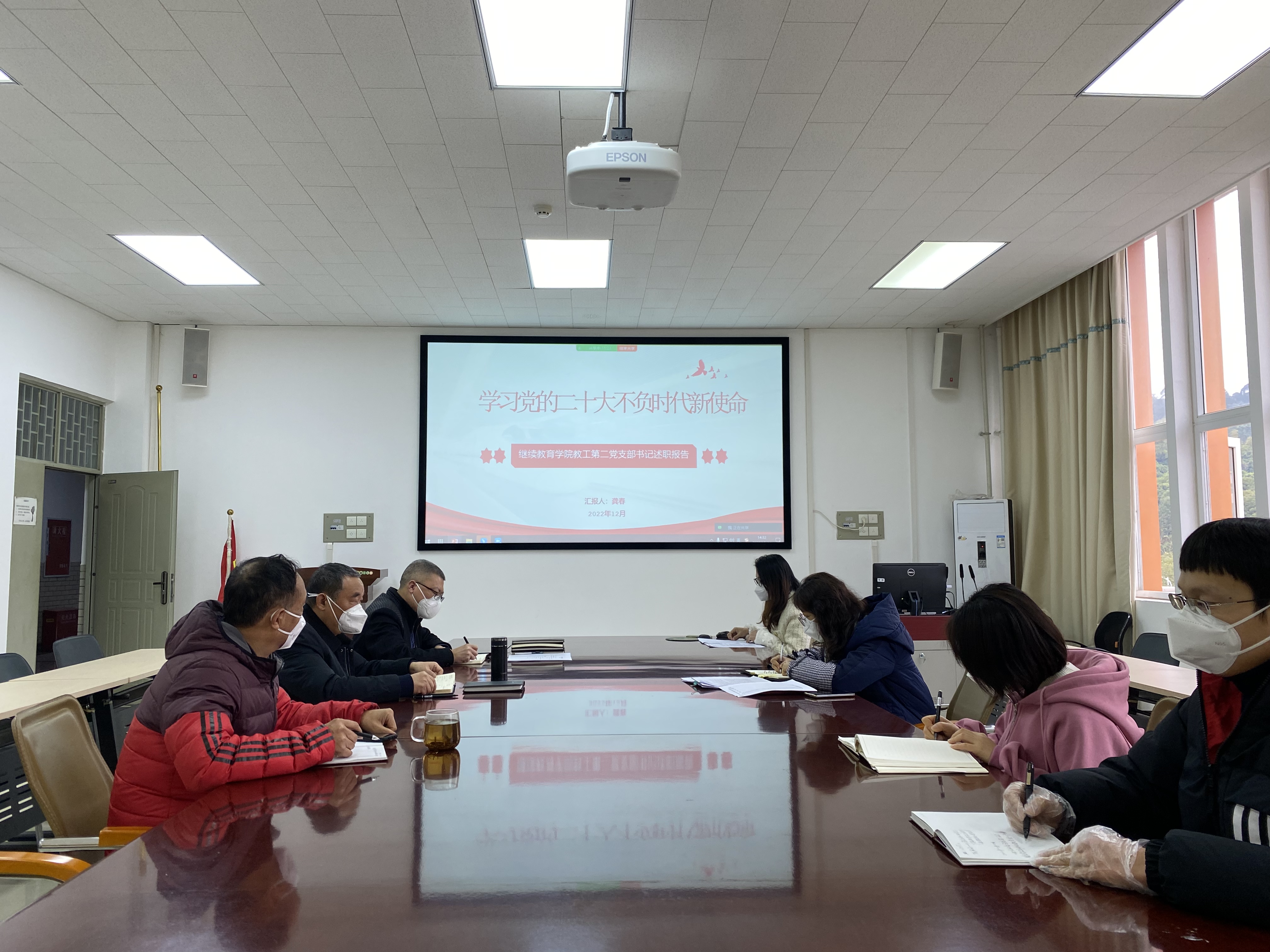 教工第二党支部书记龚春同志从加强政治建设,用习近平新时代中国特色社会主义思想凝心铸魂;服务中心大局,以系统思维推动党建工作和业务工作深度融合;夯实党建基础,以高质量落实党建工作全面提升党建工作水平;落实党风廉政建设责任,把好意识形态关口,增强党建工作活力等方面汇报了一年来的支部党建工作开展情况,同时还汇报了支部工作存在的问题及下一步工作打算。