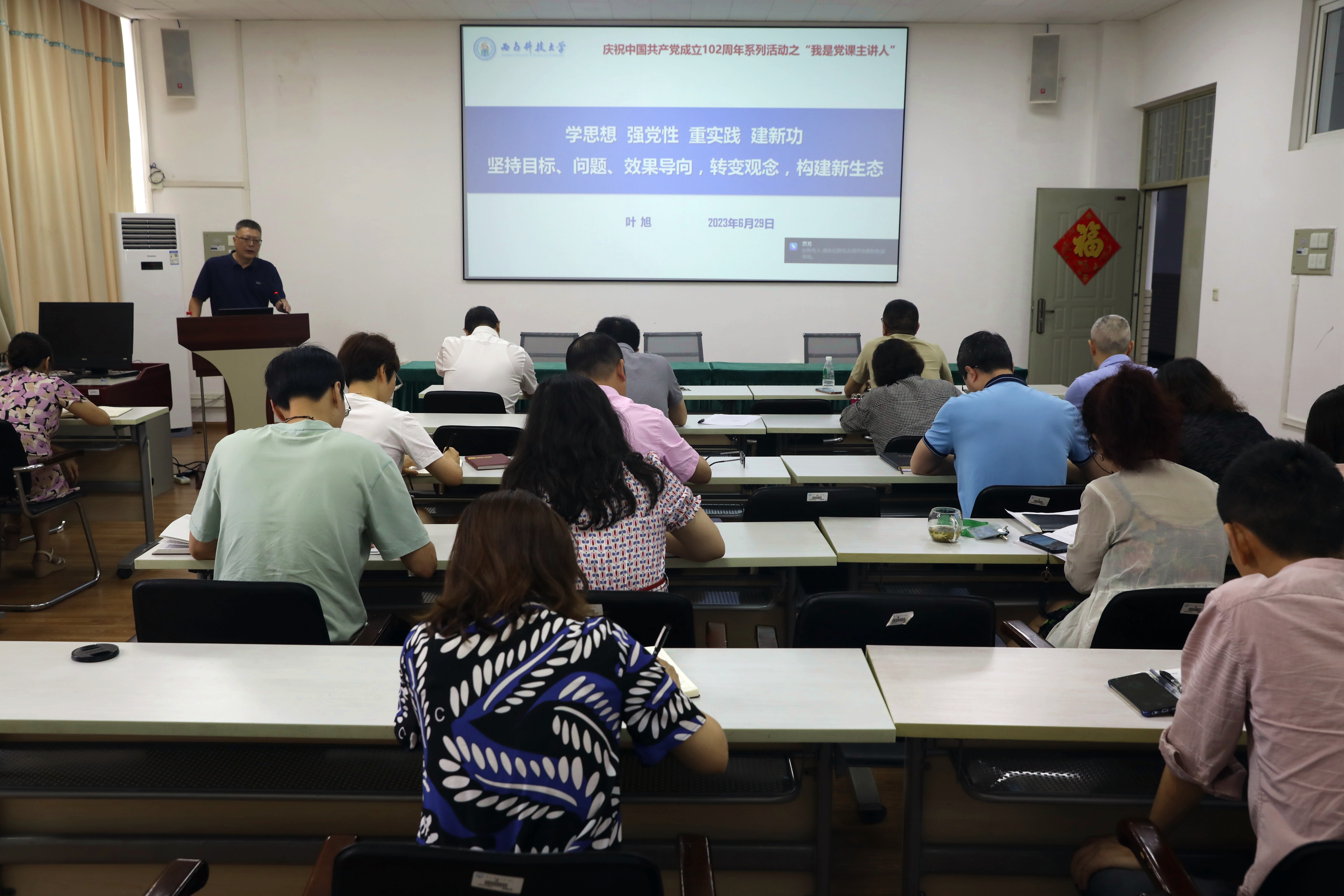为庆祝中国共产党成立102周年,推进学习贯彻习近平新时代中国特色社会主义思想主题教育走深走实,6月29日,学院党总支在五楼会议室开展“我是党课主讲人”活动,院长叶旭以《学思想 强党性 重实践 建新功—坚持目标、问题、效果导向,转变观念,构建新生态》为题,为学院全体教职工上党课。