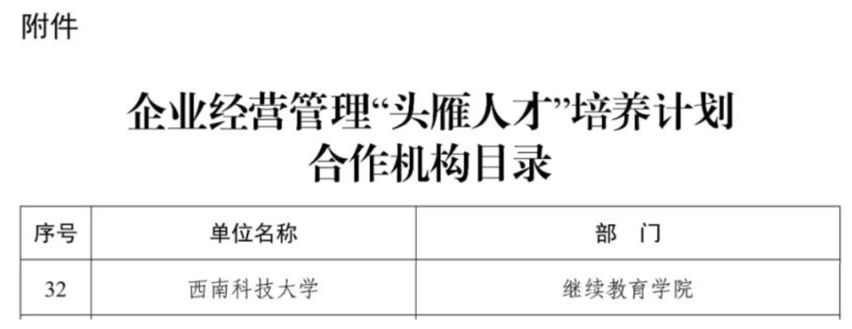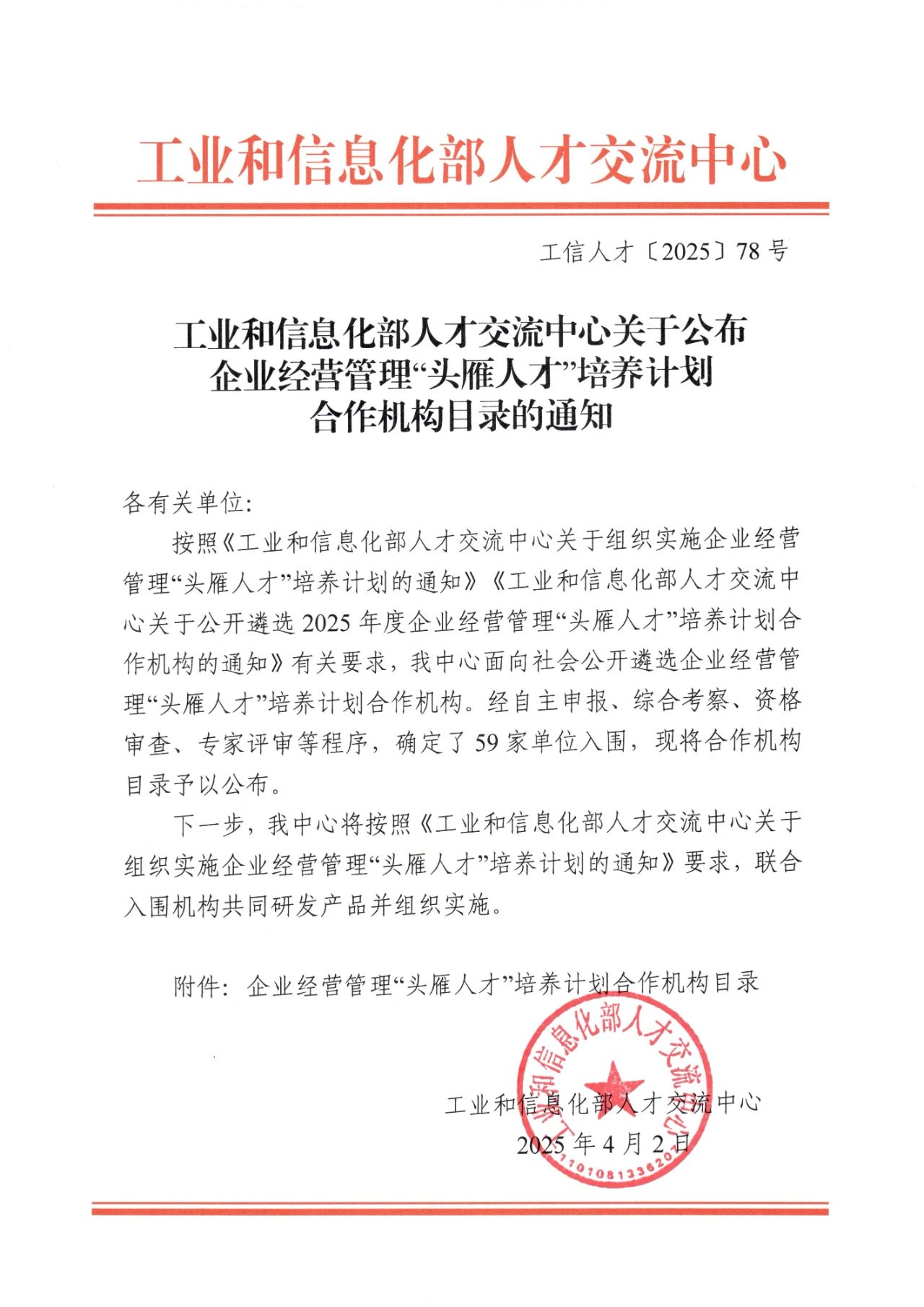 近日,工业和信息化部人才交流中心公布2025年度企业经营管理“头雁人才”培养计划合作机构目录(工信人才〔2025〕78号),我校成功入选为合作机构之一。