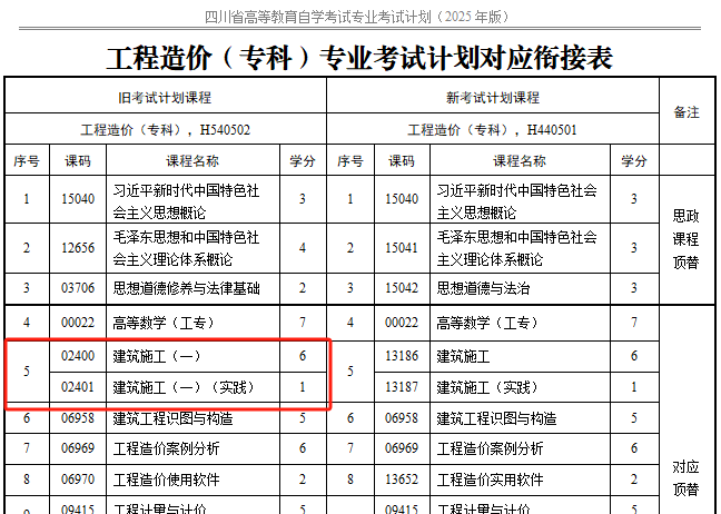 比如,工程造价(专科)专业考试计划中的“建筑施工(一)”(课程代码02400)课程,考生如果只取得了原计划中“建筑施工(一)”(课程代码02400)合格成绩,那么需要继续参加“建筑施工(一)(实践)”(课程代码02401)考核并取得合格成绩,方可按照《四川省高等教育自学考试专业考试计划对应衔接表》进行对应顶替。考生也可以直接参加新考试计划课程的考试。